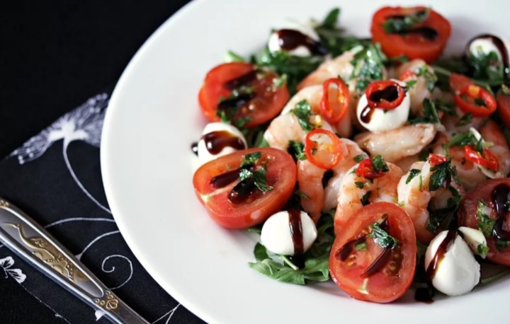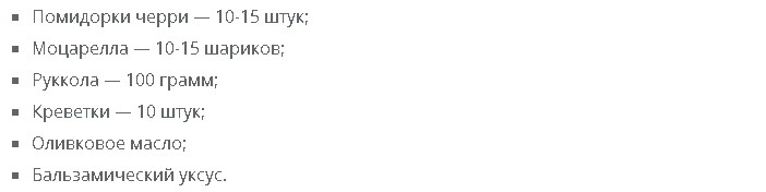 На дно глубокой емкости выложить слой рукколы, сверху разложить черри, шарики сыра и отварные креветки. Приправить оливковым маслом и бальзамическим уксусом.