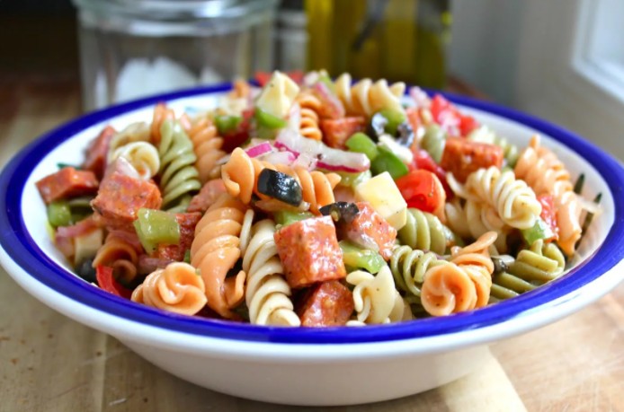 Салат с макаронами получается очень сытным и питательным. Его едят, как самостоятельное блюдо.