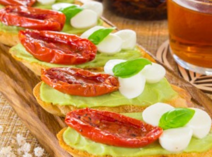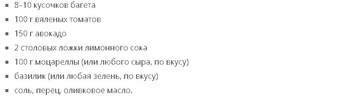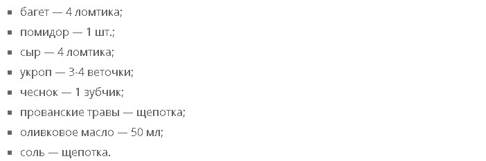 Самый просто рецепт — обжарить кусочки хлеба, натереть чесноком и положить сверху все, что вам пожелается. Можно эксперементировать с разными вкусами и компонентами.