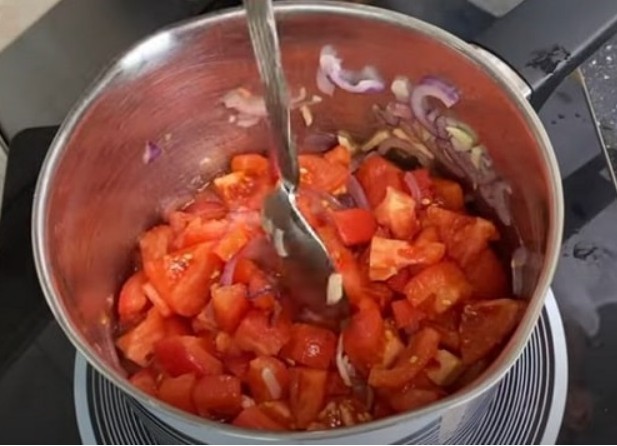• Томаты порежьте на мелкие кубики и добавьте в кастрюлю.