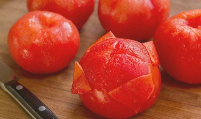 • С помидоров снимите шкурку, для этого сделайте крестообразные надрезы и опустите на две минуты в кипящую воду. Так будет легче удалить кожуру.