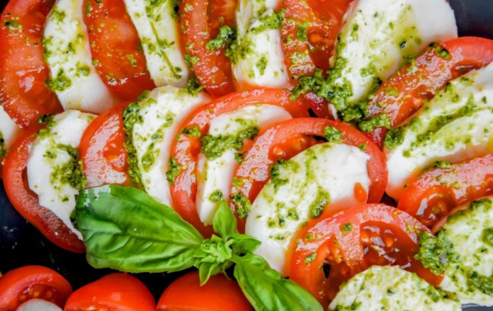 Этот салат довольно прост в приготовлении и является национальным блюдом итальянцев. В его составе — моцарелла и помидоры, а по внешнему виду он напоминает национальны флаг Италии. Придумали его на юге страны, на острове Капри, отсюда и пошло его название. Предлагаем приготовить салат с соусом песто.