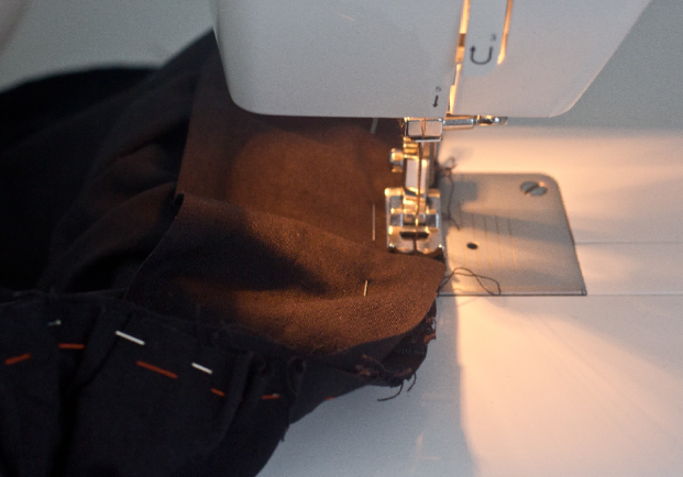 Затем делаем сборку в верхней части каждого слоя, там где будет пояс. Выполняем боковой шов. Сшиваем все слои вместе.