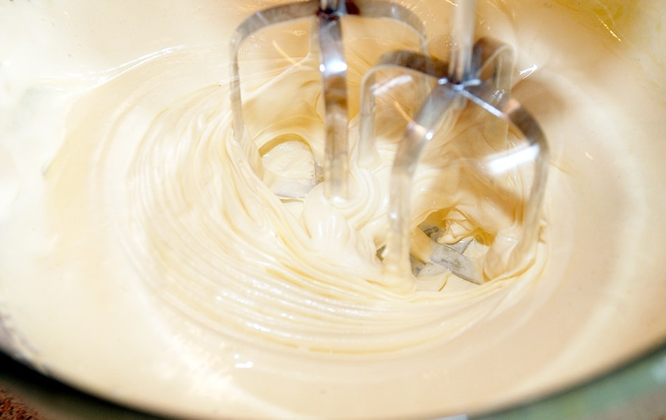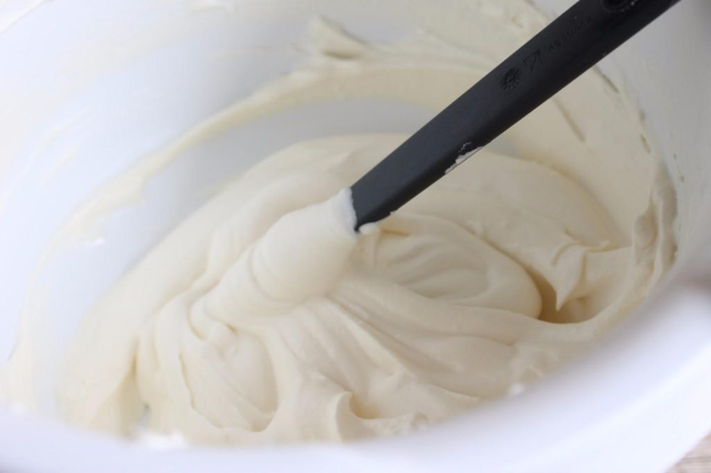 - Добавить ванилин, йогурт, сахар и взбить крем до пышной массы с помощью миксера на средних оборотах.