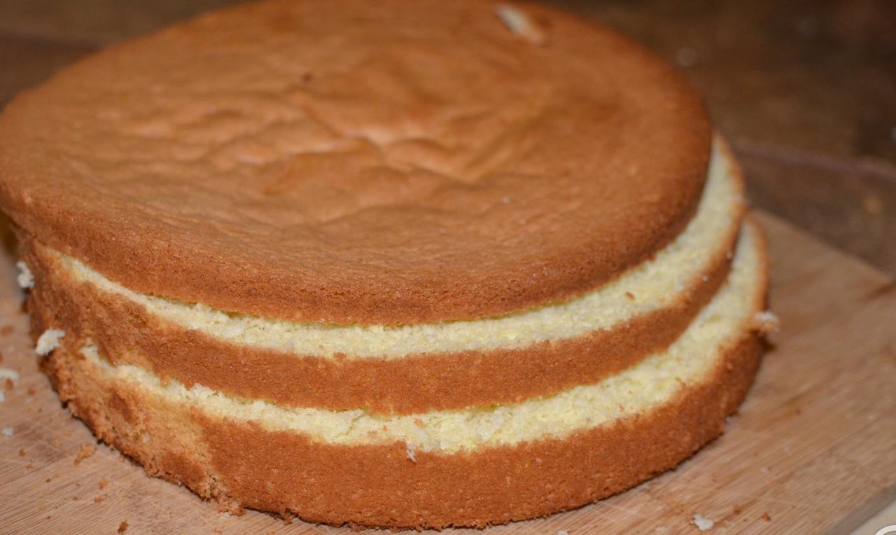 По готовности выключаем бисквит и не достаем его из духовки 5 минут. Так он примет правильную форму и не осядет. После извлекаем его из бумаги и ждем, пока он остынет. Как раз наш крем охладится и загустеет. Разрезаем остывший корж на 3 части. Если у вас получился слишком высокий корж, то можно разрезать и на 4 части.