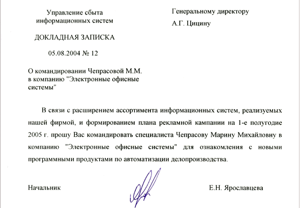 4. В конце указывается должность составителя записки, его подпись и расшифровка подписи.