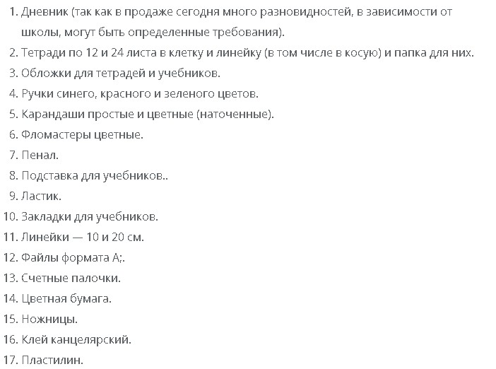Перечень того, что нужно, дает учитель на родительском собрании, после того, как сформированы классы. Происходит это, обычно, уже в мае, так что до сентября есть время закупить своему ребенку все необходимое для учебы. Мы приводим основной список, в который включили то, без чего не обойтись ни одному школьнику. Обращаем ваше внимание, что, практически, всё должно быть подписано — фамилия имя ребенка, класс.
