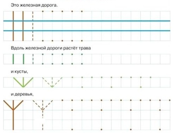 Здесь мы учим вырабатывать каллиграфический почерк и развиваем мелкую моторику рук. Выводя палочки и галочки, дошкольник привыкает сидеть достаточно продолжительное время на одном месте, что так необходимо будущему ученику на уроках.