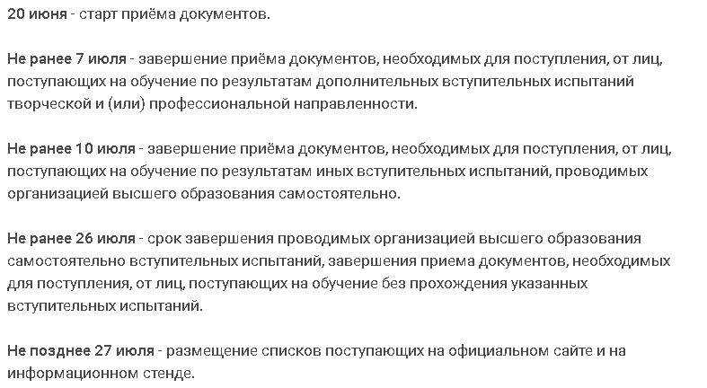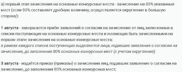 Приоритетное зачисление (по квотам). Абитуриенты из льготных кат. подают заявление на зачисление до 28 июля, тем самым изъявляя свое согласие. Приказы о зачислении подписываются 29 июля.