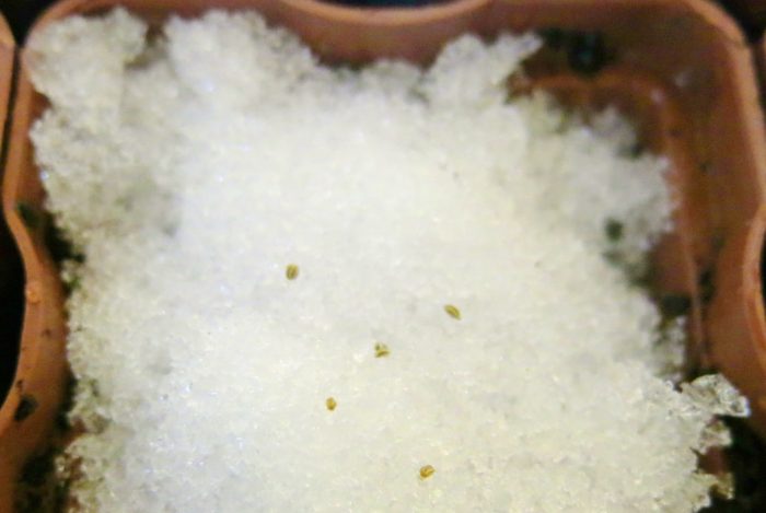 - На снег положите не более 3-5 семян сельдерея и накройте стеклом или пленкой.