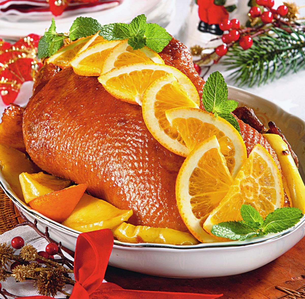 Ломтики цитрусовых органично смотрятся как на утке, так и по периметру блюда. Вы можете вывернуть дольки лимона, апельсина или грейпфрута и уложить их на грудину. Яркие краски зелени и разнообразных фруктов также являются красивым сочетанием. Например, выложите листья салата, положите на него утку и обложите ее помидорами черри, лимонными дольками.
