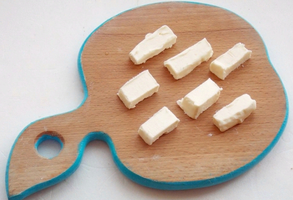 Из 3-х оставшихся яиц взбейте смесь, в нее нужно будет обмакивать котлеты. На ладони сформируйте шарик фарша, в центр выложите замороженный кусок масла, погрузите его в мясо и сформируйте продолговатую котлетку.