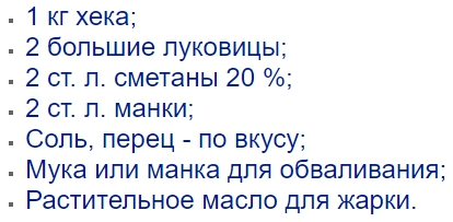 Обработайте хек и выделите из него филе. Отожмите из него лишний сок и перекрутите на мясорубке. Вместе с рыбой перекручивайте лук, закладывая попеременно кусок рыбы, кусок лука. После приготовления рыбной массы, выложите в нее сметану, манку, соль, перец и тщательно перемешайте до однородности. Сформируйте рыбные биточки и обмокните их муку. Жарьте котлеты из хека на раскаленной сковороде в растительном масле.