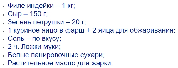 На мясорубке перекрутите филе индейки в фарш. Отдельно натрите сыр на средней терке. Мелко порубите зелень. Соедините все эти ингредиенты и добавьте к ним 1 яйцо. Перемешайте фарш до однородности, предварительно посолив. Далее подготовьте смесь для кляра: взбейте 2 яйца с мукой, немного их присолив. Теперь формируйте котлеты, каждую при помощи вилки опускайте в яичный кляр, а после погружайте в горку с панировочными сухарями. Не используйте руки, на них прилипает много теста. Жарьте котлеты из индейки на растительном масле.
