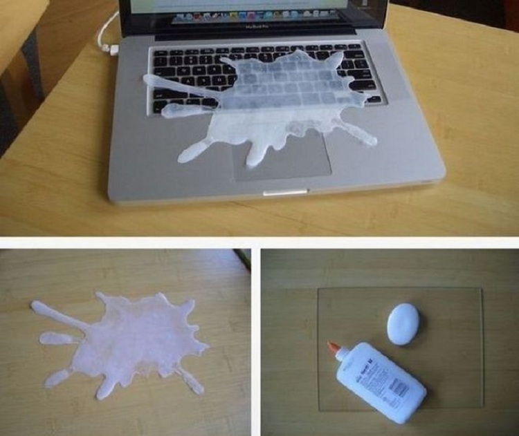 Нет ничего проще, чем разыграть любимого используя его ноутбук. Найдите в интернете фото выдающее поломку ноутбука, скачайте его. Приготовьте заранее клей, лучше ПВА. Пролейте его на пленку. Когда подсохнет полностью, приступайте к действию. Установите скачанное фото вместо заставки, удалите все ярлычки с рабочего стола. Налейте в чашку молока, поставьте рядом с техникой на столе, начинайте плакать.