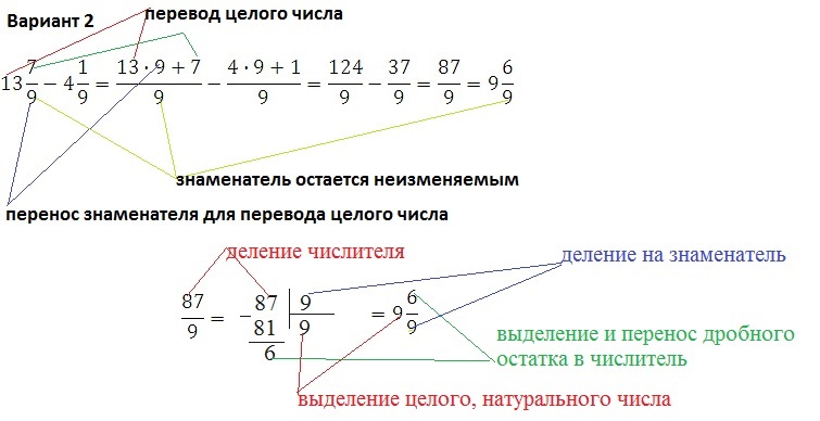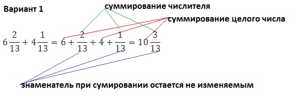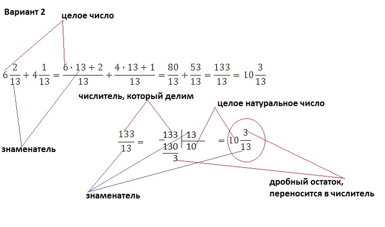 При решении заданий можно перевести число в неправильную дробь, затем суммировать. Завершающим этапом станет выделение целого числа и остатка.