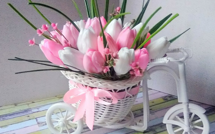 Вот такой нежный букет из разных цветов в светлых оттенках можно сделать для своей мамы или бабушки на день рождения. Вы можете взять красивый горшочек, установить в него все заготовленные цветочки из мыла. При составлении композиции учитывайте либо личные предпочтения в цветах, которые есть у того, кому вы хотите подарить букет, либо время года, чтобы это были сезонные цветы.