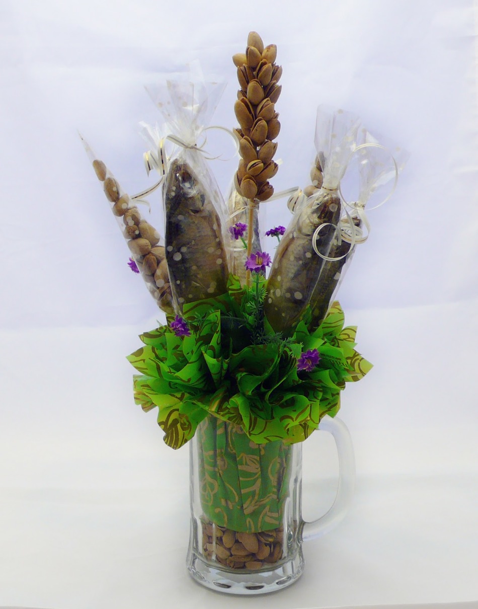 - В качестве декораций не всегда можно использовать оберточную бумагу, рыба отлично поместится и в пивном бокале. Несколько шпажек с рыбой в окружении орехов идеально дополнят пивной набор. По желанию в букет можно добавить колбаски, овощи, зелень;