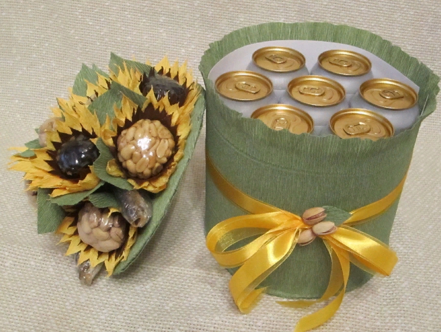 - Букет из закусок может выглядеть абсолютно по-разному. Мы предлагаем вариант оформления в виде цветов подсолнуха. В этом нам поможет гофрированная бумага желтого и зеленого цвета, напоминающая сочетание настоящего подсолнечника. В специально подготовленную упаковку прозрачного содержания вкладываем орехи, семечки, сыр и пр. Заворачиваем круглый кулек и оборачиваем его по краям гофрированной бумагой. В таком стиле выдерживаем всю закуску, дополняем букет пивным бочонком или баночным ассорти;
