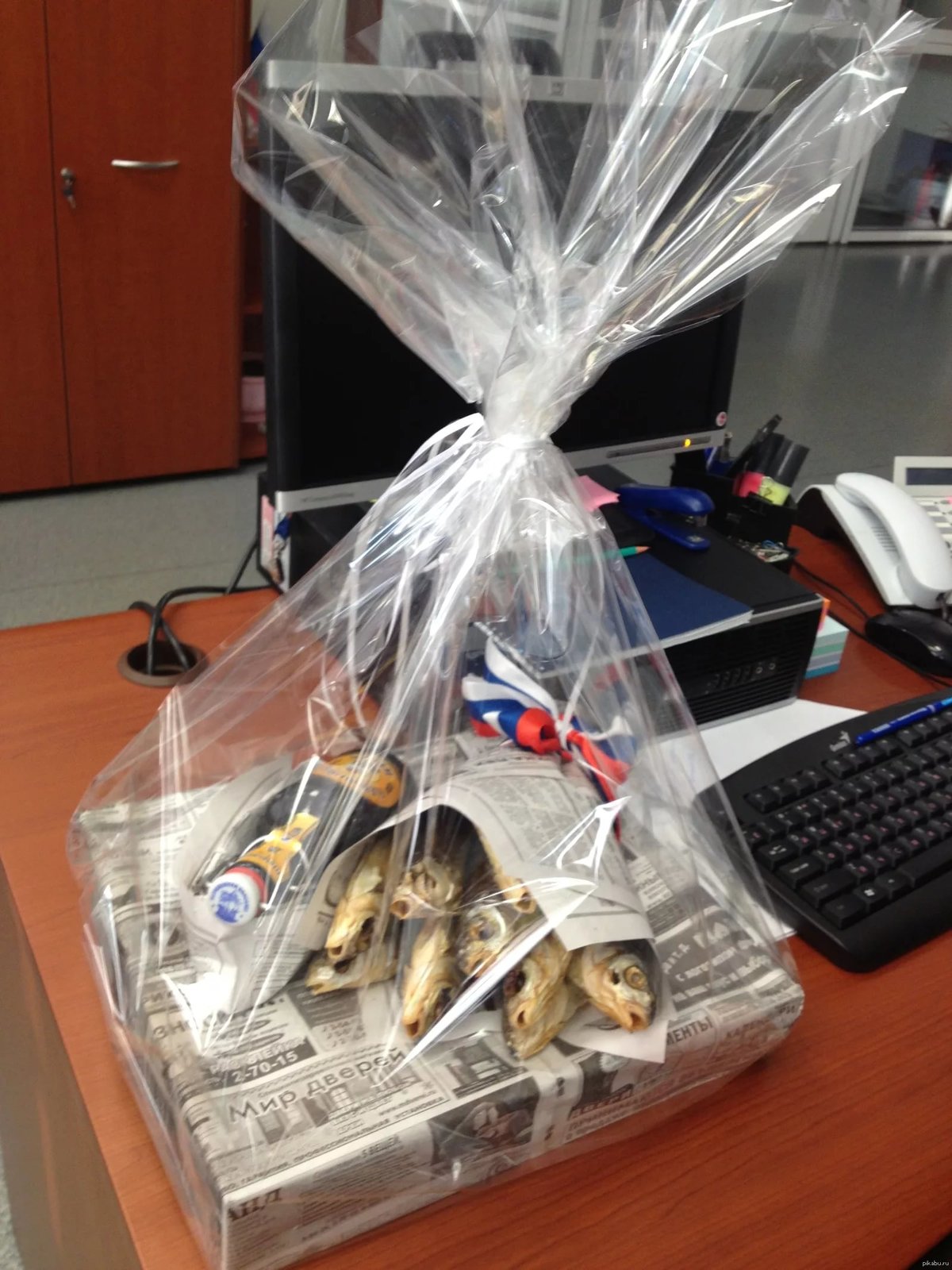 Для создания шуточной композиции желательно раскопать в подвальных кулуарах архивный тираж Правды, Известий, Советской России, Труда. Если повезет, то одной газеты будет вполне достаточно. Пусть она будет желтой и обветшалой, это только придаст ценность рыбному букету. Выложите рыбу на уголок и заверните старинный артефакт, свяжите композицию атласной лентой. Букет готов.
