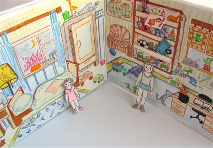 На каждом из разворотов девочка может нарисовать определённую тематически оформленную комнатку. Благодаря такой конструкции можно придать объектам интерьера объёмную форму, вырезав двери, створки или посадочное место за столом. Таким образом, куколок малышка сможет уложить спать, накормить вкусным обедом или искупать в ванной.