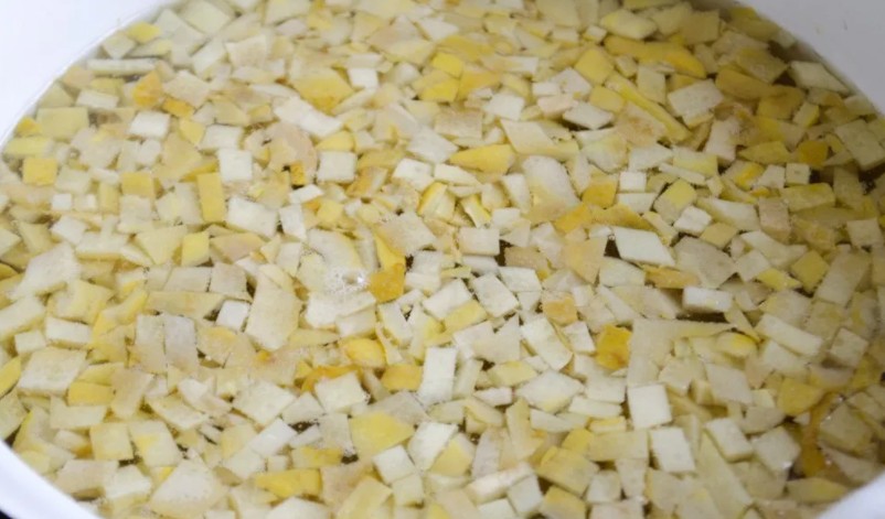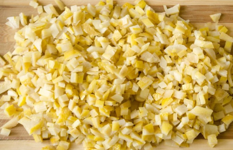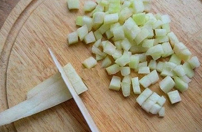 - Когда корки вымочились, их нарезают на полоски или кубики.