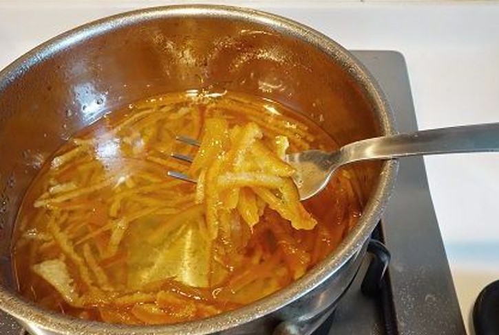 - Порезанные корки положить в сироп и на умеренном огне проварить еще 15 минут.
