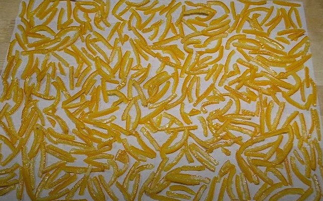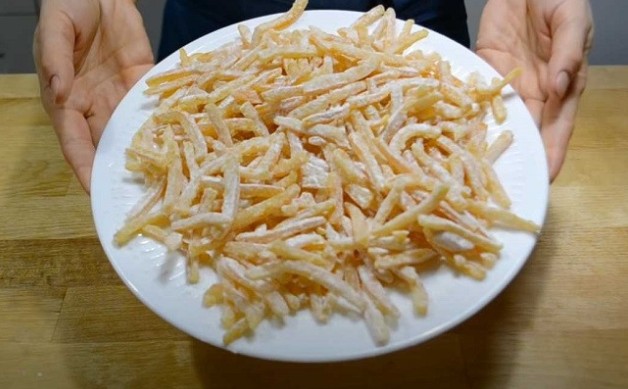 - После того, как корки три раза проварились и немного обсохли, их нужно нарезать соломкой.