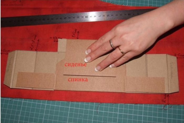 Из ткани вырезаем детали, не забывая про припуски (2-3 см.) И собираем детали спинки и сиденья, подклеивая внутрь припуски.
