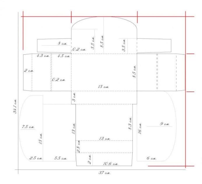 На картоне сделайте разметку, как указано на чертеже. Красные линии для удобства построения, сплошные черные линии — для разреза, пунктирные — для сгиба. Пунктирные линии нужно биговать — предварительно продавливать, чтобы сгиб был ровным. Для этого подойдет закругленный конец линейки или ножа.