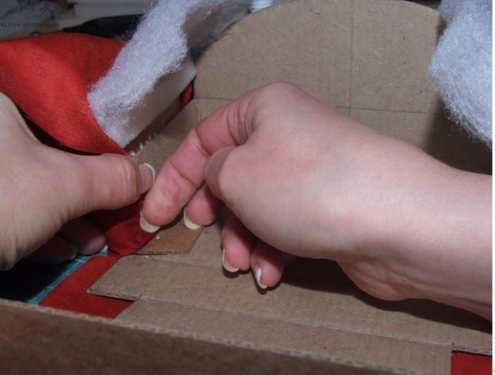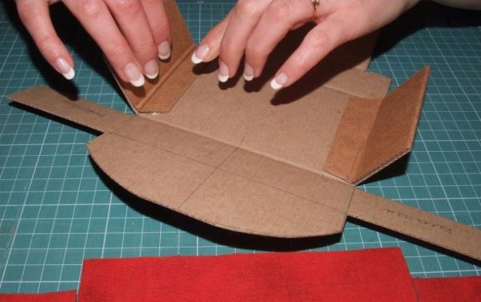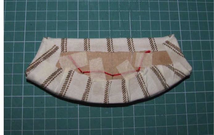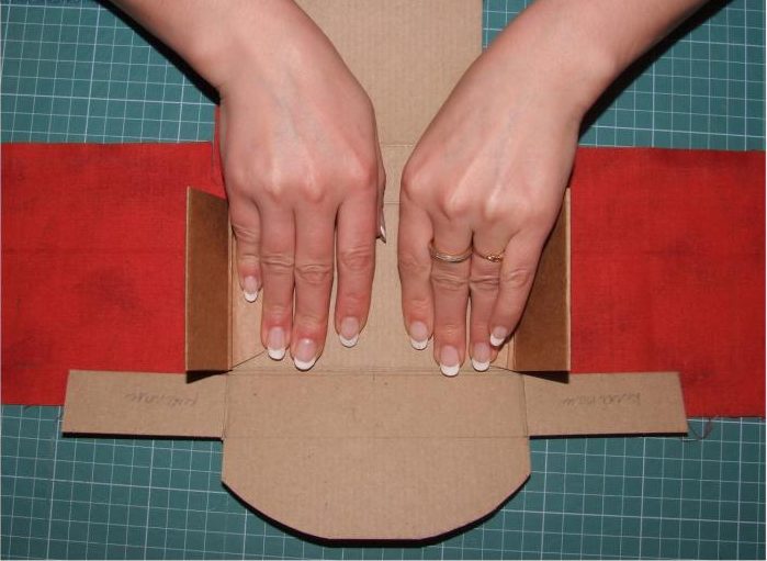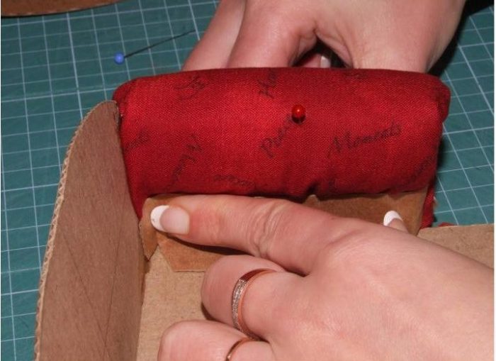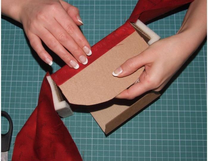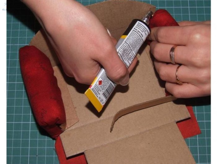 Теперь приступаем к сборке сиденья. Для этого между картоном и тканью помещаем бортик из синтепона, а затем подклеиваем припуски.