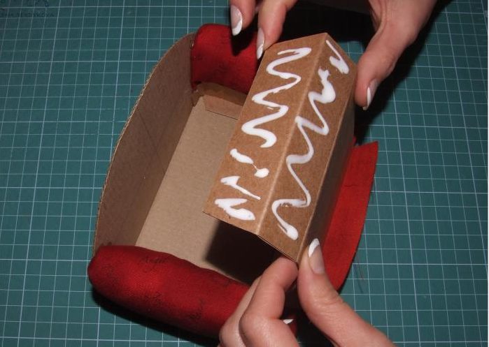Подклеиваем подлокотники к донышку дивана клеем ПВА.