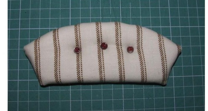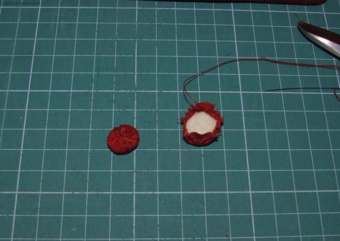 Прошиваем стыки подлокотников и фасада. Вырезаем два круга (1,5 см в диаметре) из картона, шарика синтепона и ткани (припуск в 1 см). Шьем вот такие детальки.