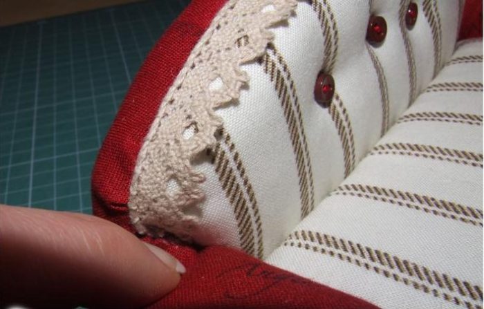 Последние штрихи: отмеряем кружево с учетом припусков (+3 см). Наносим тонкой линией клей ПВА на стык спинок и приклеиваем кружево. Припуски смазываем клеем и прячем между подлокотником и спинкой, заправляя их зубочисткой. Также крепим кружево под сиденьем.