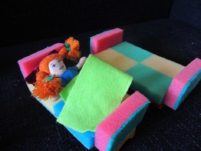 Губки для мытья посуды также могут стать частью кукольной мебели. Их можно использовать вместо поролона при изготовлении диванов и кресел, а можно представить их как готовые детали.