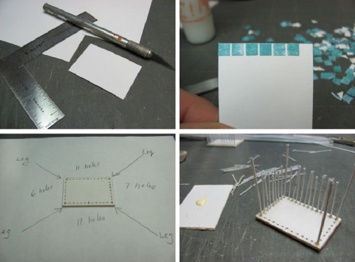 Вырезаем из картона столешницу нужного размера. С помощью шила по углам делаем отверстия для ножек, а по периметру дырочки для стоек.