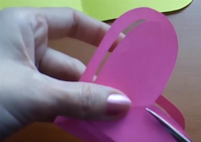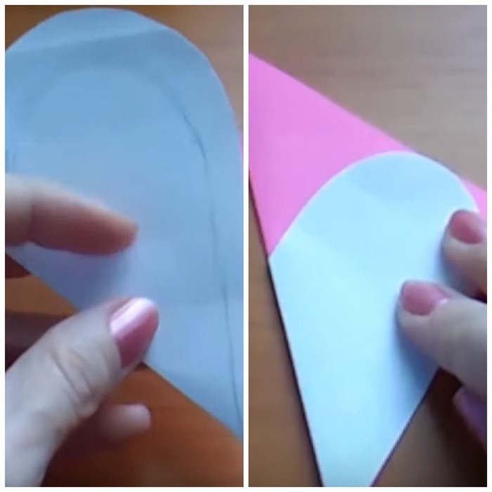 - Новый шаблон приложите к бумаге другого цвета (в нашем варианте розового), сложенной пополам, обведите, вырежьте.