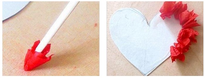 Из картона вырежьте сердечко произвольного размера. Салфетки или бумагу цветную нарежьте квадратиками со стороной 1,5 см. К тупой стороне карандаша приложите квадратик и примните к карандашу. Макните карандаш с бумагой в клей и приклейте к сердечку.