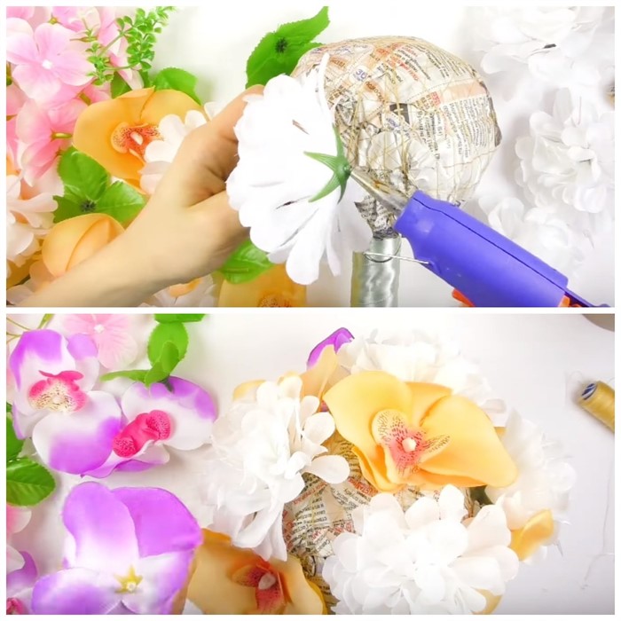 6. Приклейте к шару искусственные цветы. Старайтесь заполнить все пустоты.