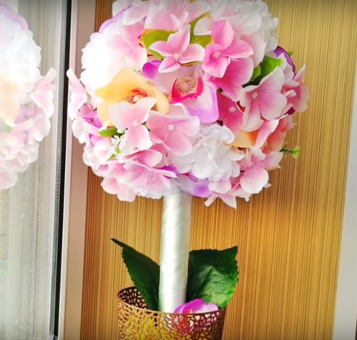 Ежегодно в садиках проходят выставки, на которые несут свои поделки не детки, а мамы. На такую выставку принято приносить экспонаты не привязанные к определенной тематике. Мы предлагаем сделать яркий, весенний топиарий. Для его создания потребуются: газеты или шар из пенопласта, нитки, трубка бумажная от фольги или пергамента, горшок, камешки, цветы искусственные, пистолет клеевой и лента атласная.