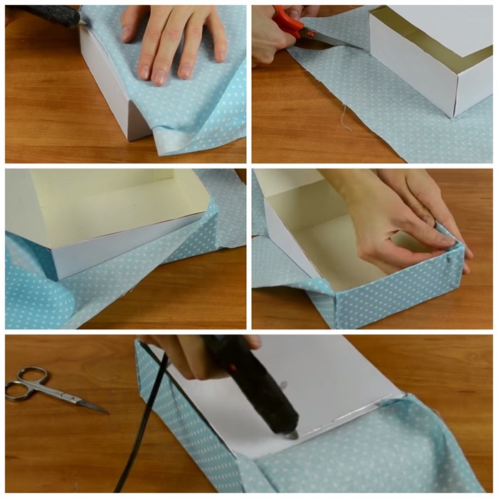 - Установите коробку на кусок ткани, Отметьте расположение, после чего зафиксируйте ткань на нижней части коробки термоклеем. Если нет клеевого пистолета, его можно заменить клеем Момент «Кристалл».