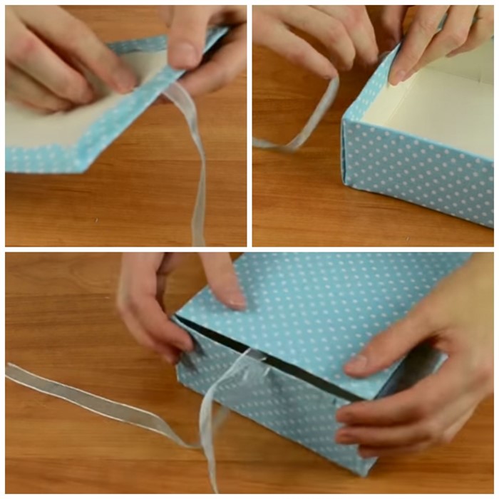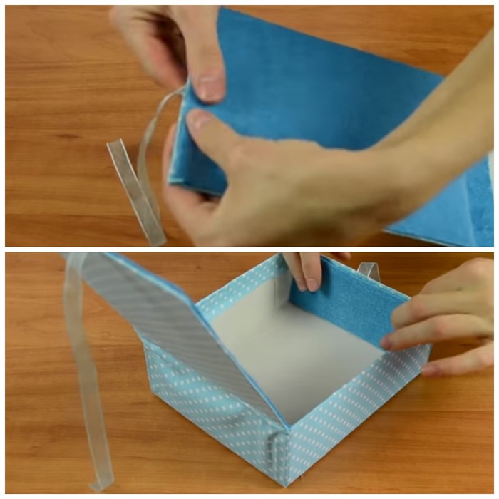 - На середину внутренней части крышки и на переднюю боковую стенку приклейте атласную ленту.