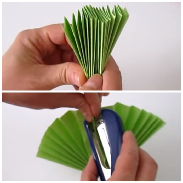 - Полученную гармошку сложите пополам, центральные части скрепите степлером. Должен получиться веер.