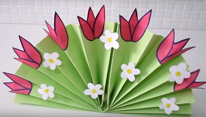 - Вырежьте разноцветные цветочки, например тюльпаны и ромашки, наведите контуры маркером. Приклейте к вееру.