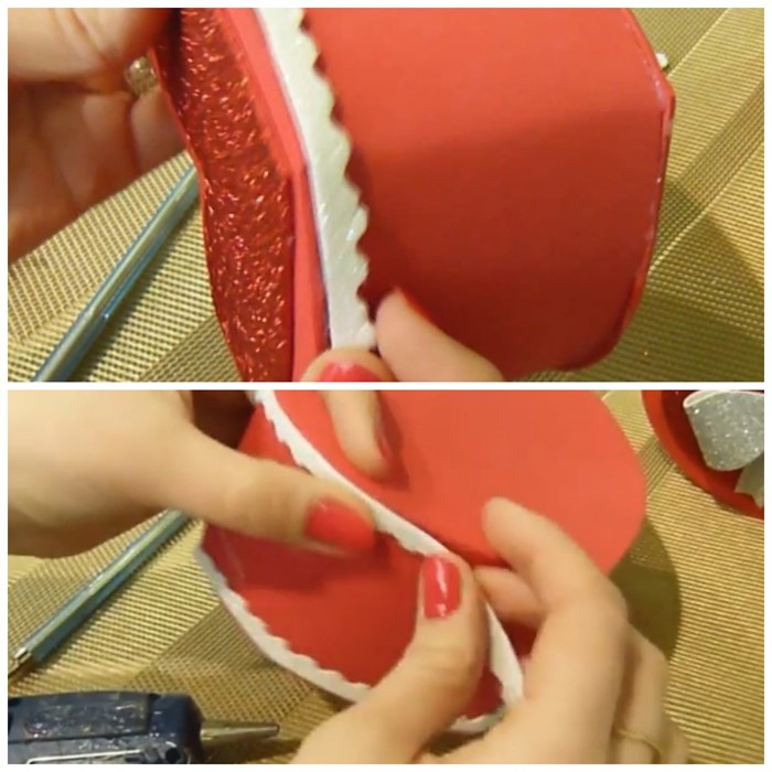 8. Чтобы запрятать остатки клея на стыках больших сердец, из глитерного фоамирана другого оттенка (в нашем варианте белого) вырежьте тонкую фигурную полосочку и обклейте ей стык с обеих сторон.