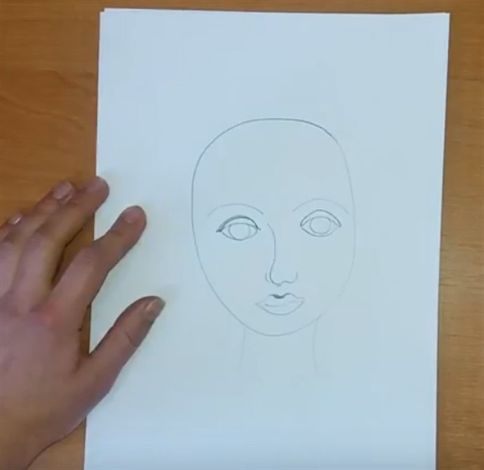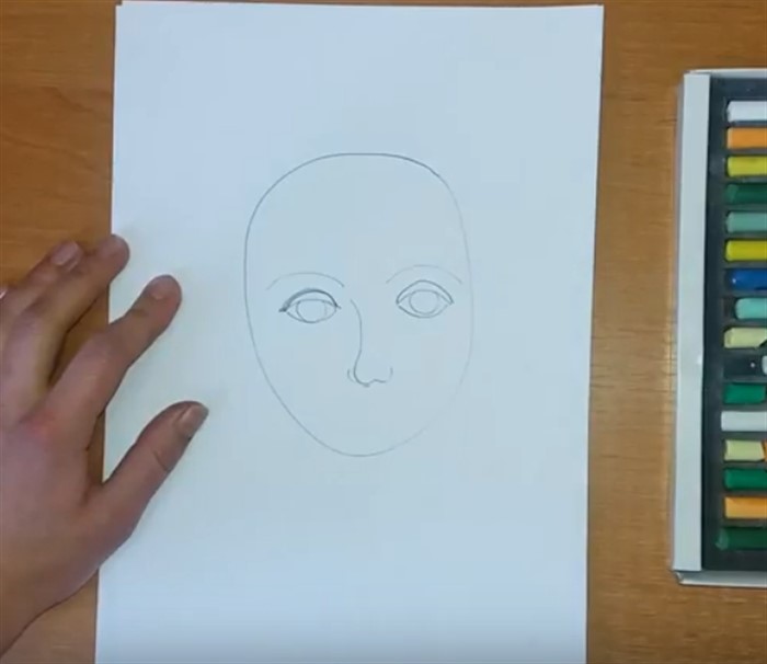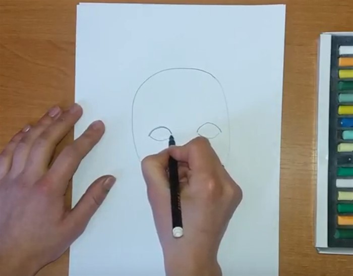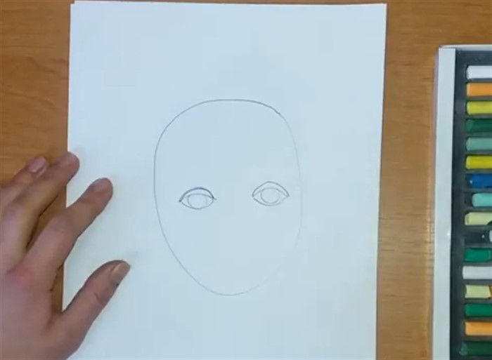 - Условно найдите серединку овала и нарисуйте глазки.