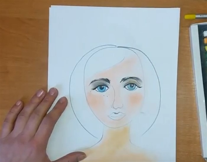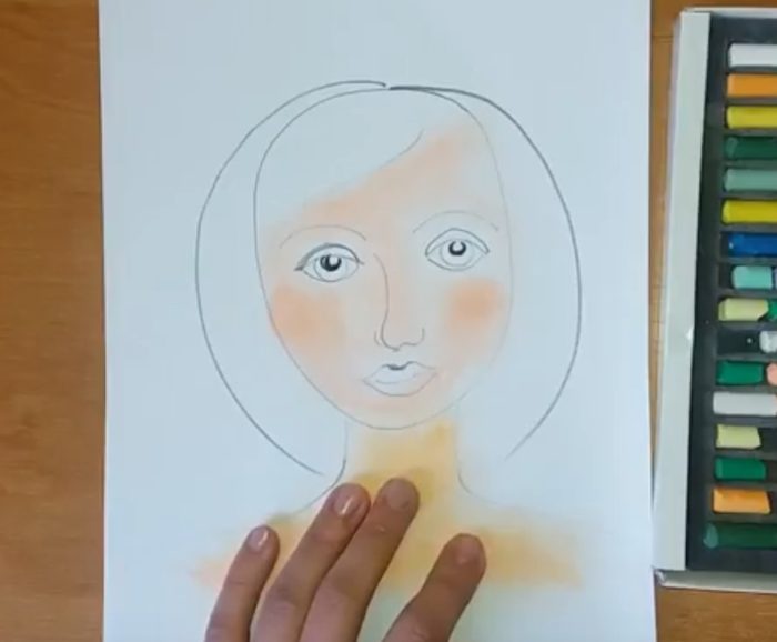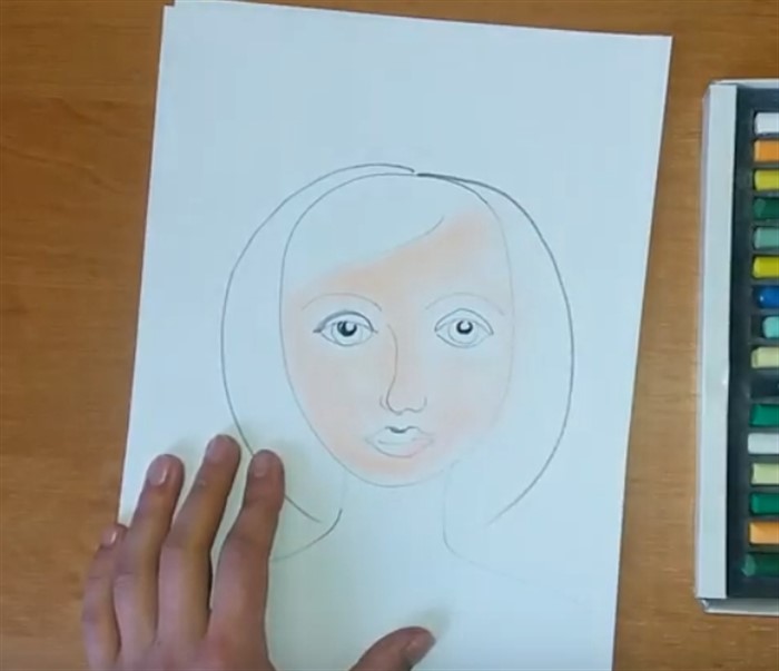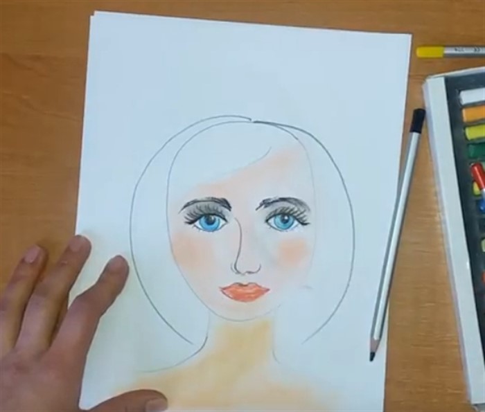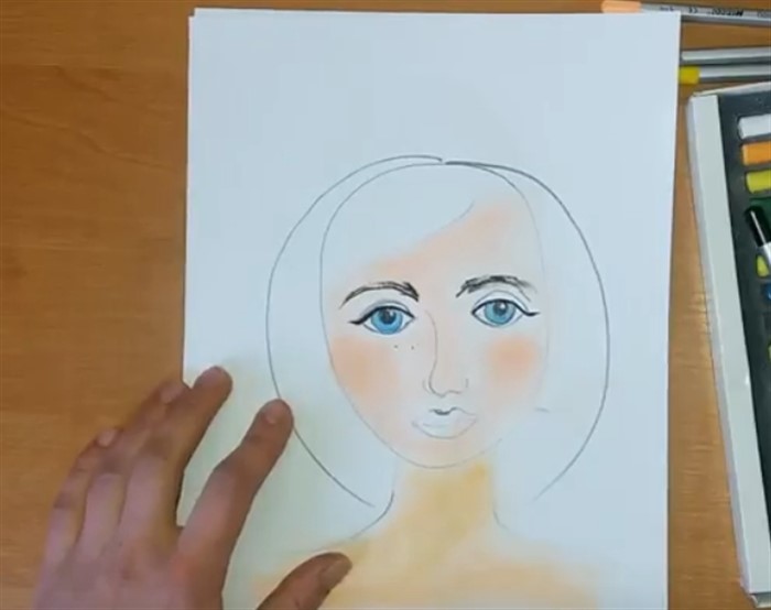 - Возьмите оттенок карандаша максимально похожий к цвету кожи вашей мамы, и раскрасьте лицо (не трогая волосы) и шею.