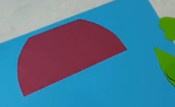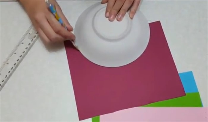 1. К листу бумаги разноцветной приложите маленькую тарелку как на картинке, обведите, затем вырежьте. Это будет ваза.