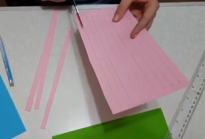 2. На розовой бумаге, уложив ее вертикально, отметьте 13 отрезков по обе стороны шириной 1,5 см, затем соедините их линиями и вырежьте.