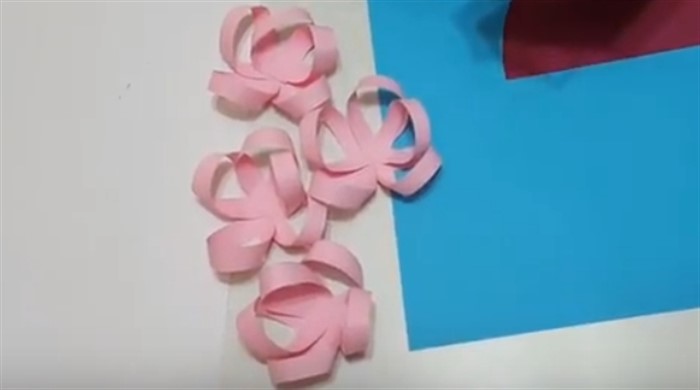 7. Возьмите первый отрезок, сложите его пополам и заведите один конец за другой, склейте. Проделайте ту же манипуляцию с остальными отрезками. Это будут лепестки.